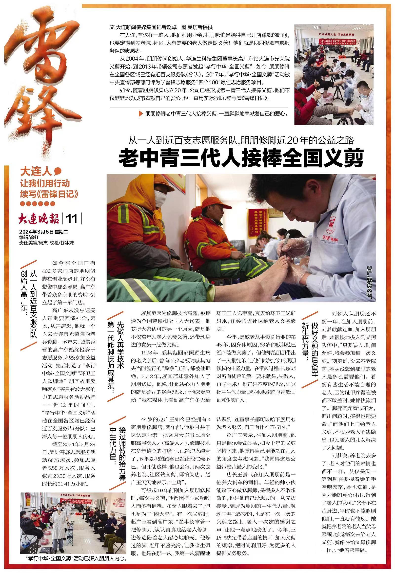 如今,随着朋朋修脚成立20年,公司已经形成老中青三代人接棒义剪,他们不仅默默地为城市奉献自己的爱心,也一直用实际行动,续写着《雷锋日记》。